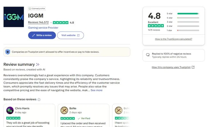 Currently, IGGM has a 4.8 rating on Trustpilot and over 145,000 user reviews, with the majority of these ratings being 4-5 stars. IGGM frequently cites its high ratings and numerous reviews as positive evidence of its stable service. Therefore, for Diablo 4 paying users, it's clear that they are generally very satisfied with IGGM's service.