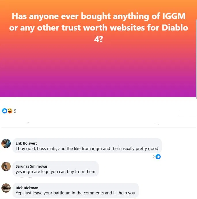 In Diablo Trading Facebook group, many players have been asking whether it's reliable to get Diablo 4 gold on IGGM, clearly reflecting their concerns about the security of their accounts. However, in multiple Facebook discussions, many players stated that they have been using IGGM to buy Diablo 4 items and boss materials for several seasons and trust them completely. Meanwhile, some players questioned IGGM's legitimacy and attempted to persuade users to buy materials from them.